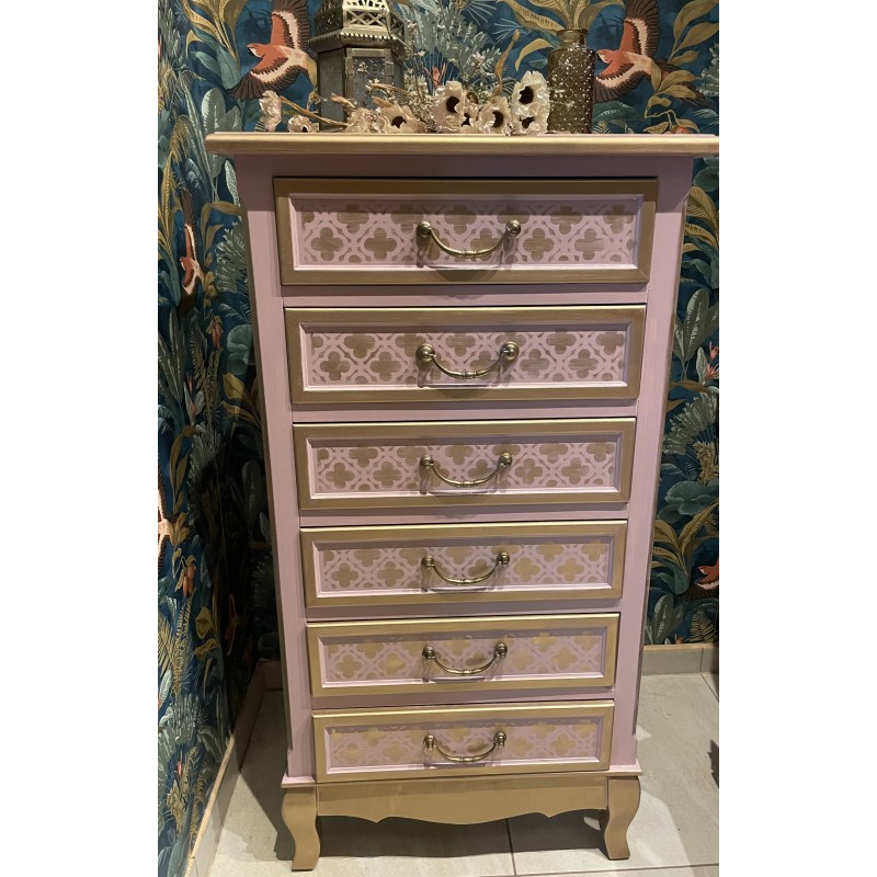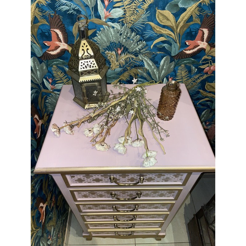 Komoda w kolorze pudrowego różu i złota.