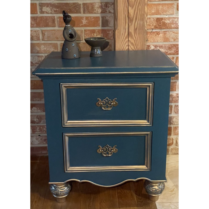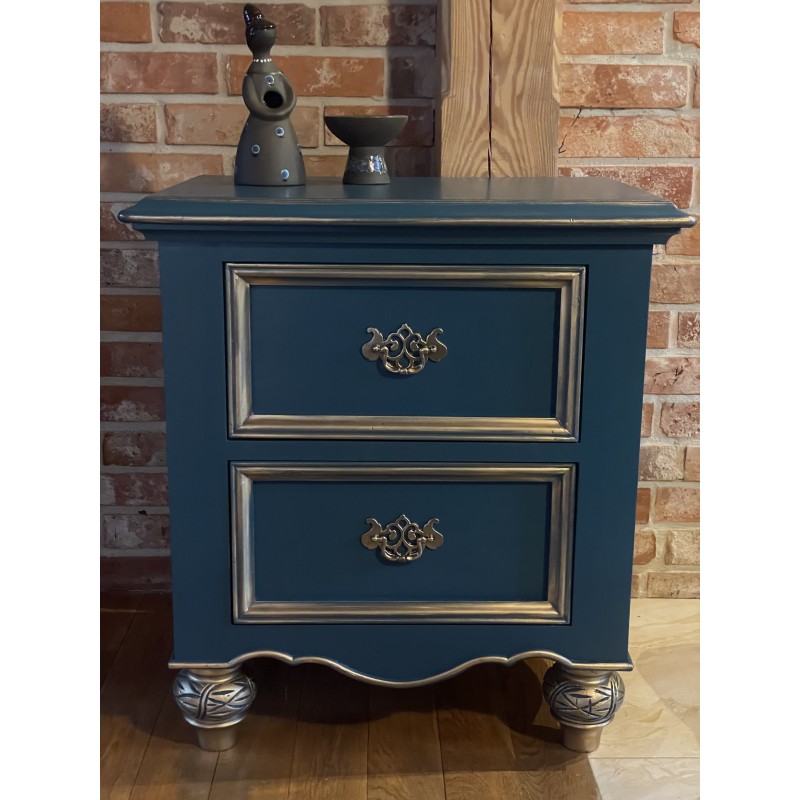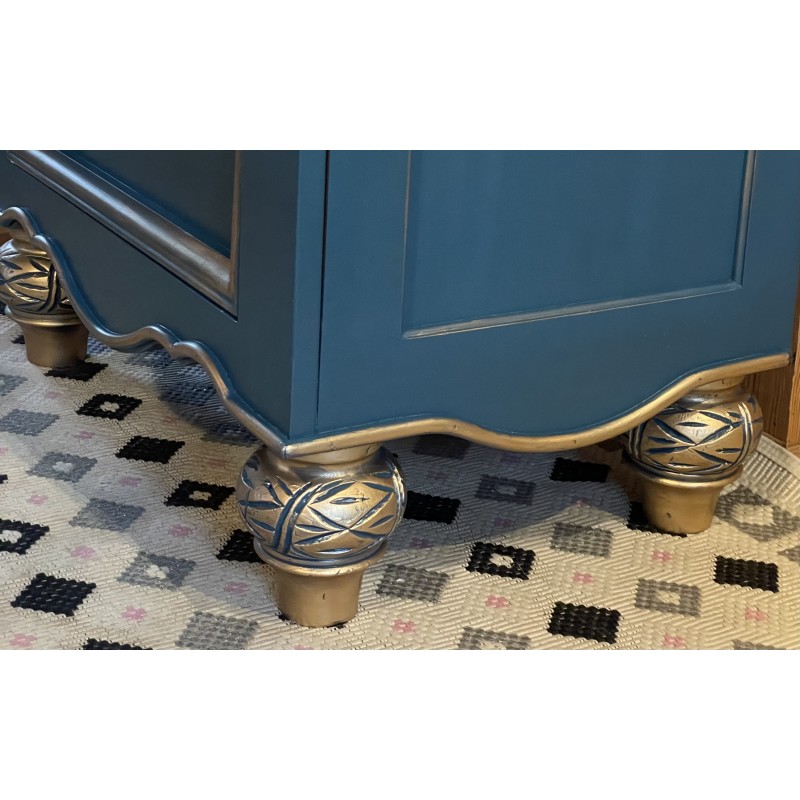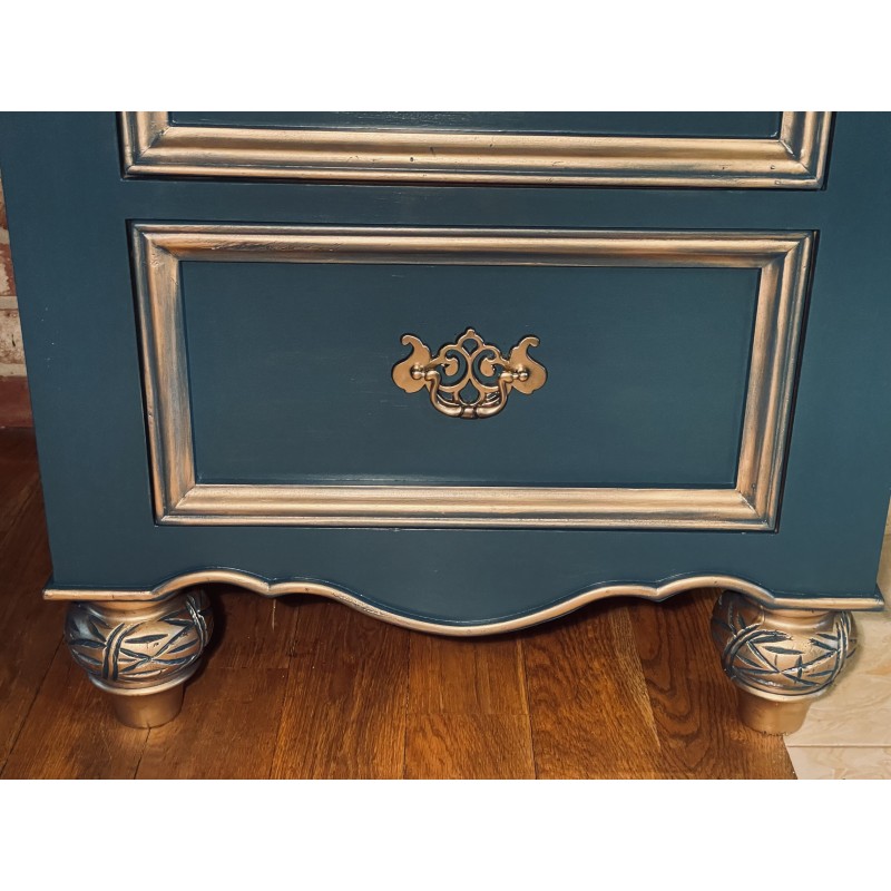 Drewniana komoda w wyjątkowym niebieskim kolorze. Piękne , złote uchwyty.