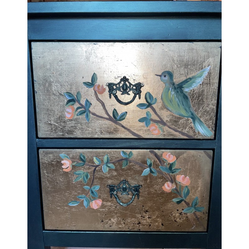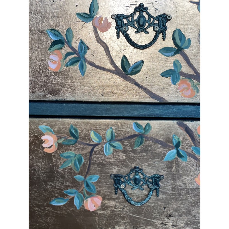 Szafka nocna z ręcznie malowanym ptaszkiem i motywem roślinnym.kolor satynowa zieleń i złoto.