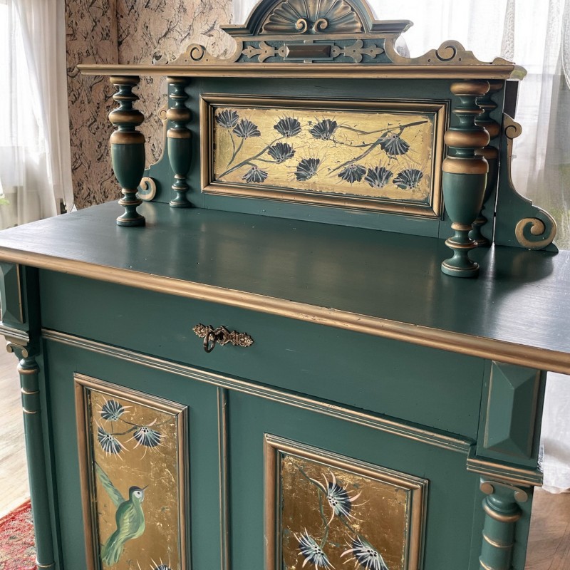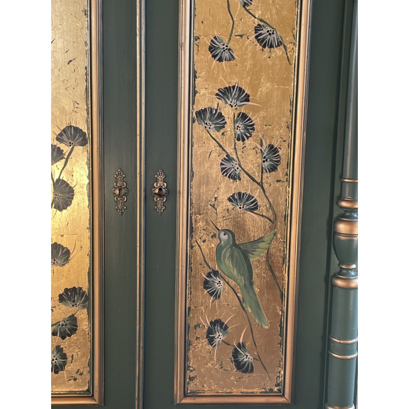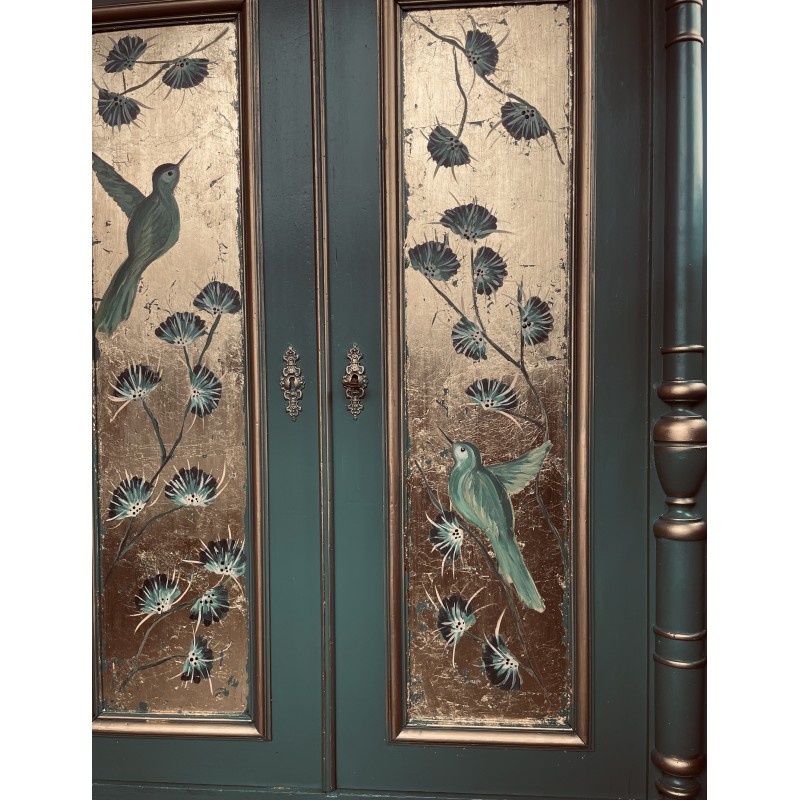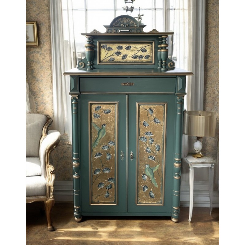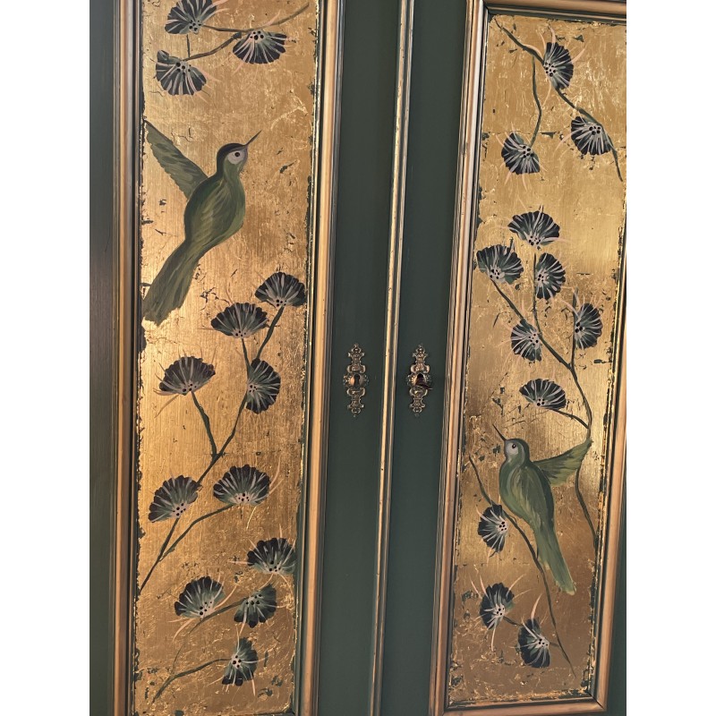 Drewniana bieliźniarka w kolorze zielono złotym. Ręcznie malowany motyw roślinny oraz ptaki.