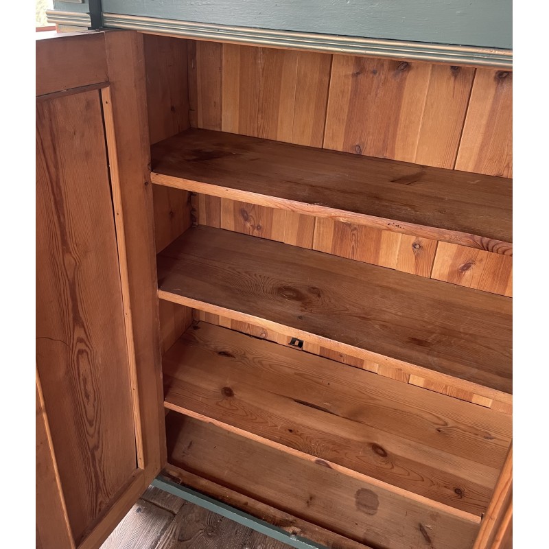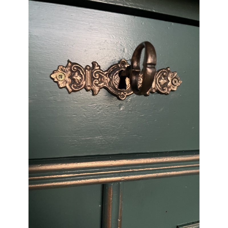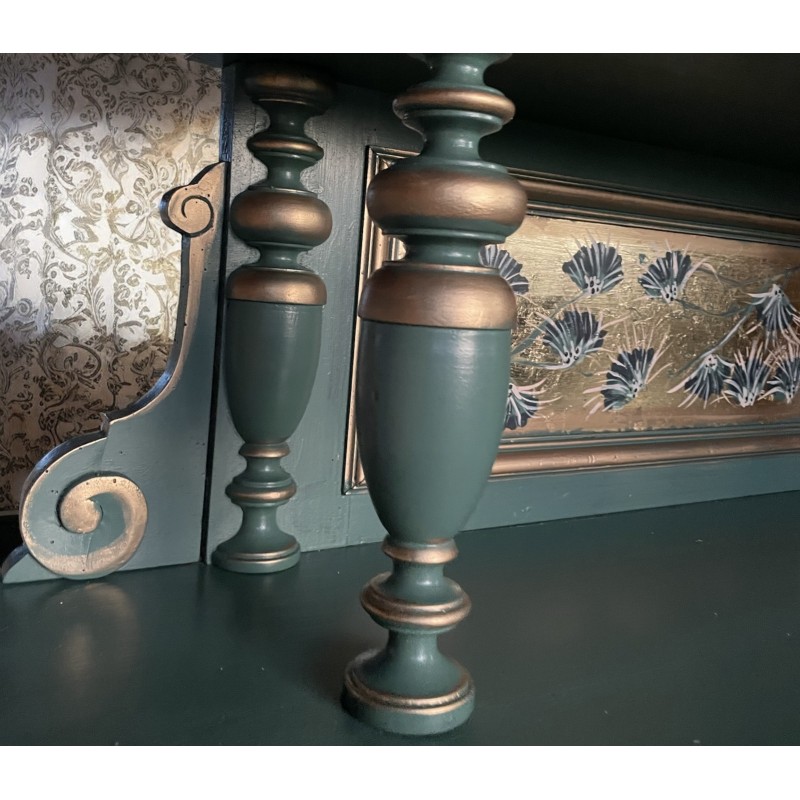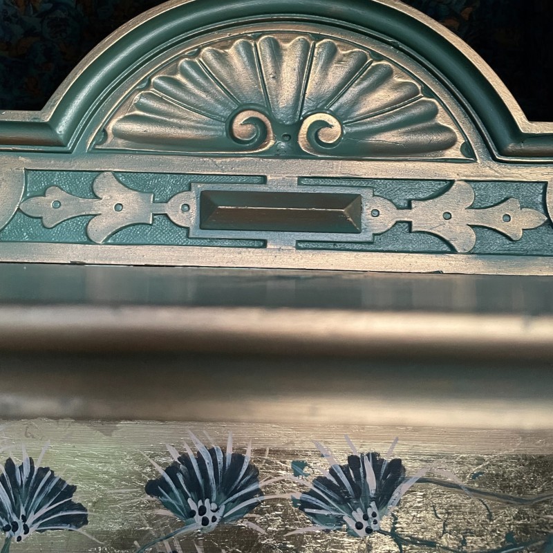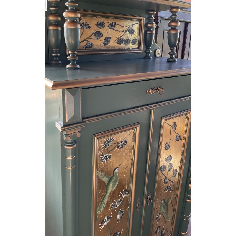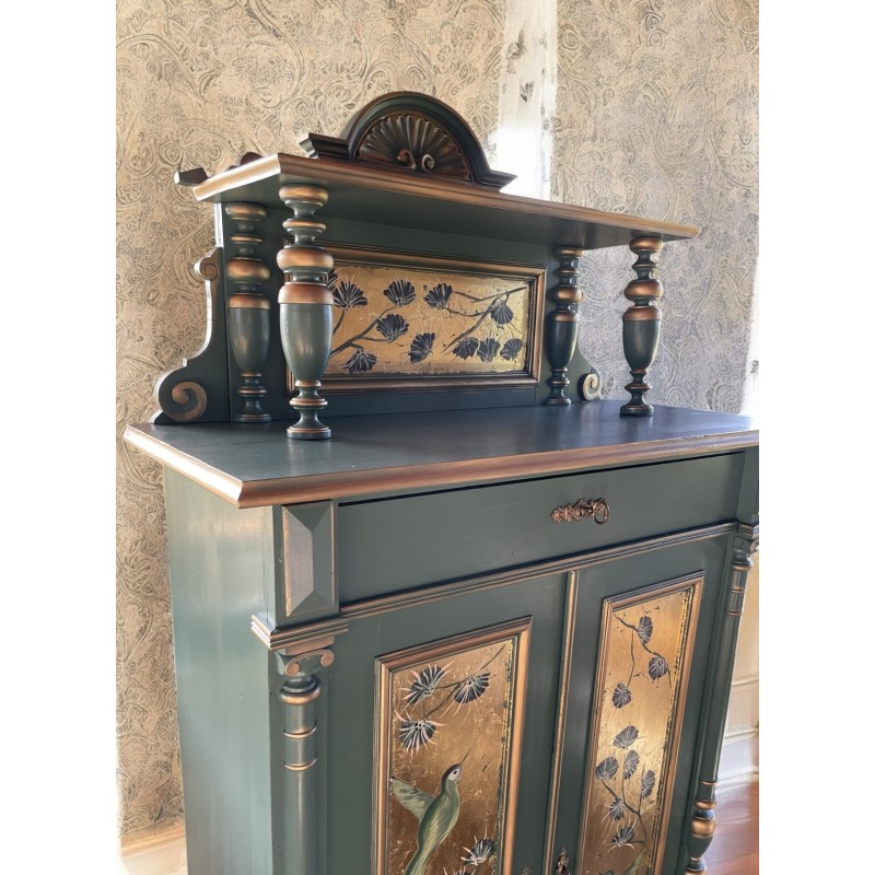 Drewniana bieliźniarka w kolorze zielono złotym. Ręcznie malowany motyw roślinny oraz ptaki.