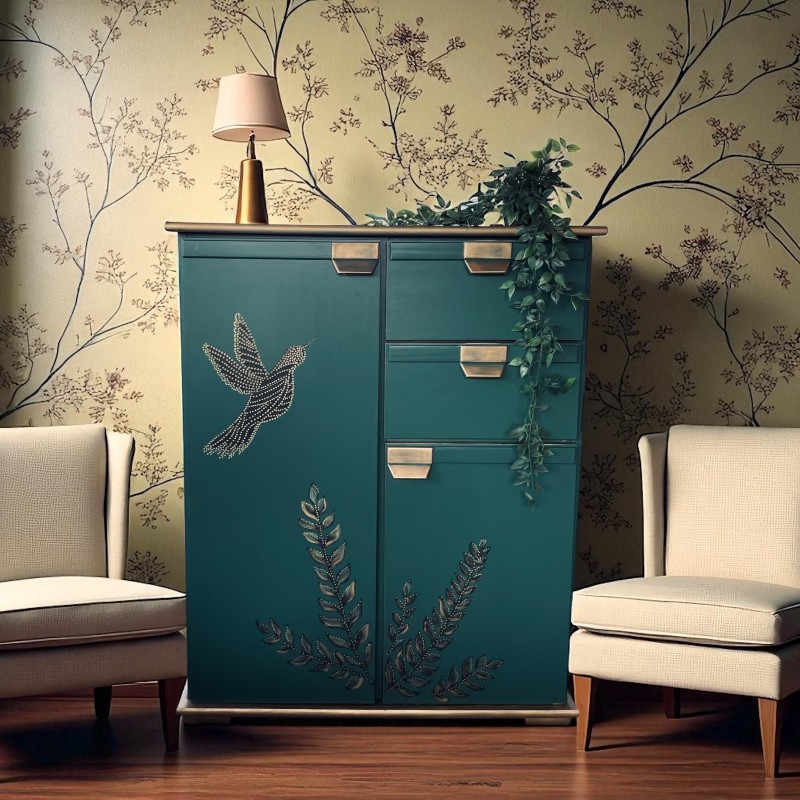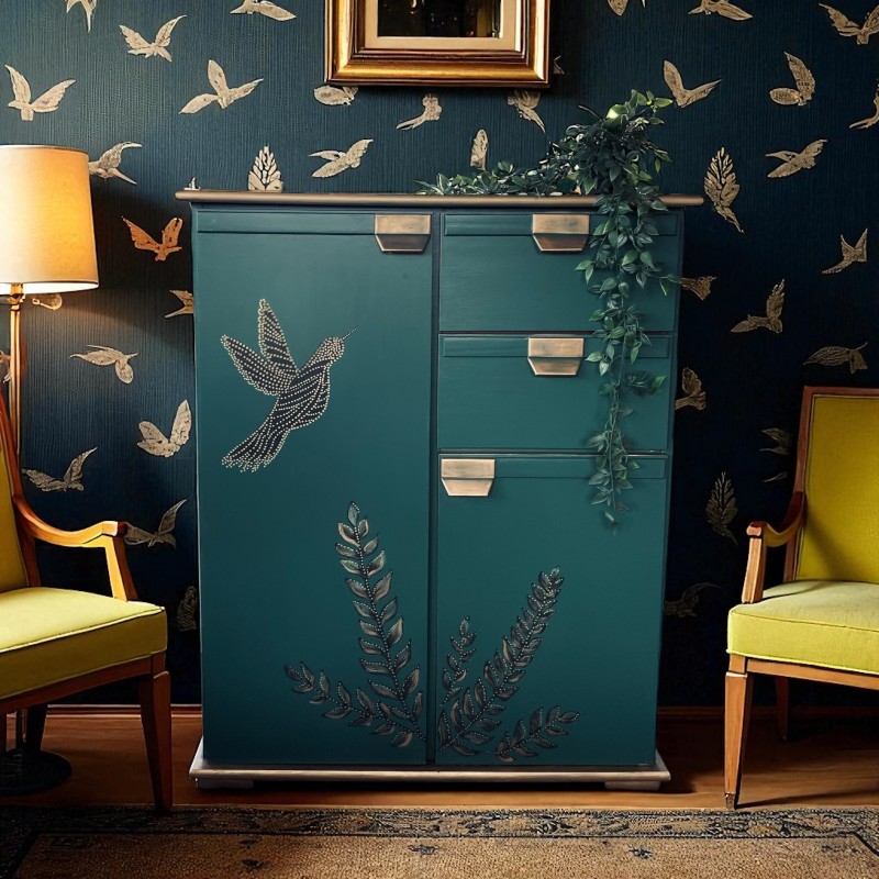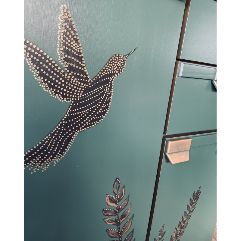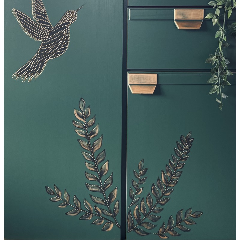 w kolorze butelkowej zieleni z ręcznie malowanym ptakiem oraz motywem roślinnym.
