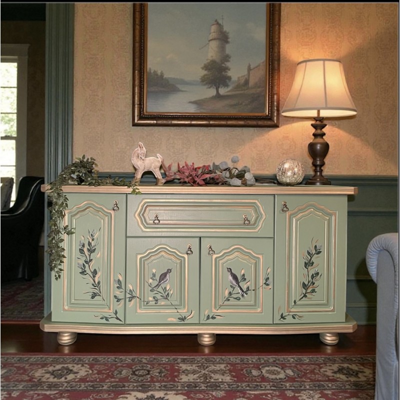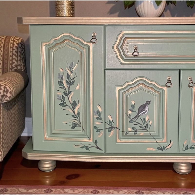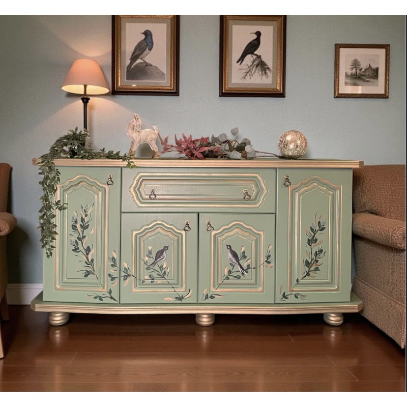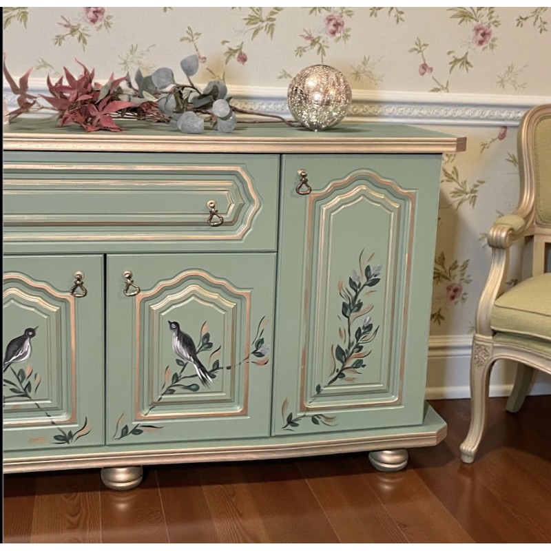 komoda w kolorze zielonym , ręcznie malowana. Motyw roślinny i ptaszki.
